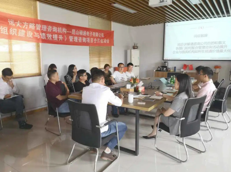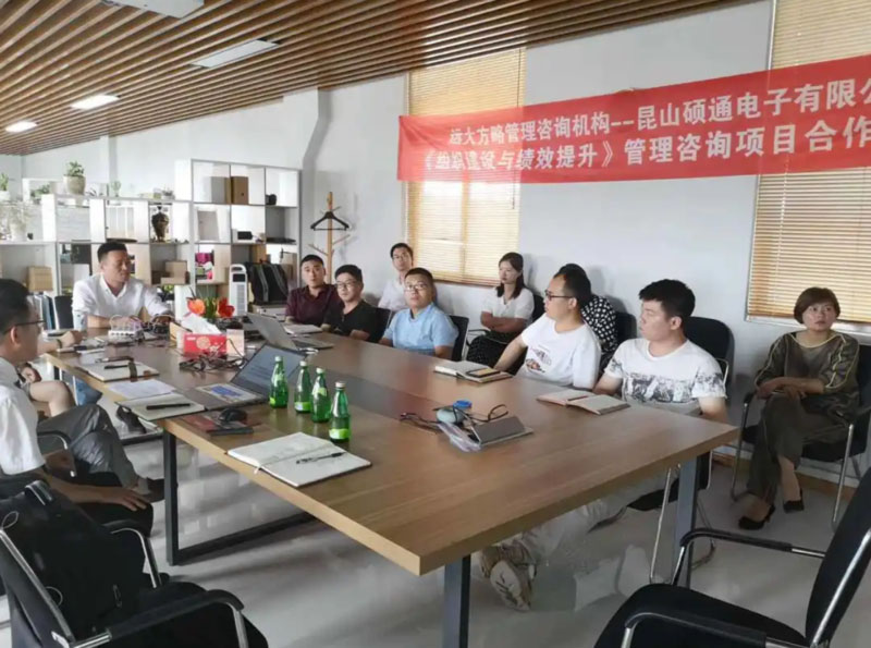 昆山碩通電子有限公司(以下簡稱“碩通電子”)攜手遠大方略啟動《組織建設與績效提升》管理改善項目。遠大方略項目總監劉老師、遠大方略咨詢師呂老師入駐碩通電子,通過前期對碩通電子公司的深入調研與探討,本期項目主要圍繞企業現狀診斷、管理者角色轉型、組織結構優化、崗位職責優化、薪酬體系優化、績效體系優化、年終獎方案等展開改善。